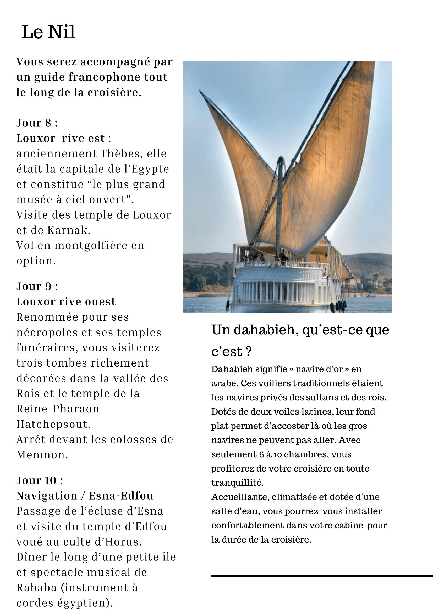 Un séjour authentique en dahabiya est une expérience unique et charmante qui vous permettra de remonter le temps et de découvrir l'Égypte d'une manière traditionnelle. Pendant votre navigation, vous aurez l'occasion de visiter divers sites historiques, temples, et autres trésors de l'Égypte ancienne et vous pourrez accoster où vous voulez contrairement aux gros bateaux.