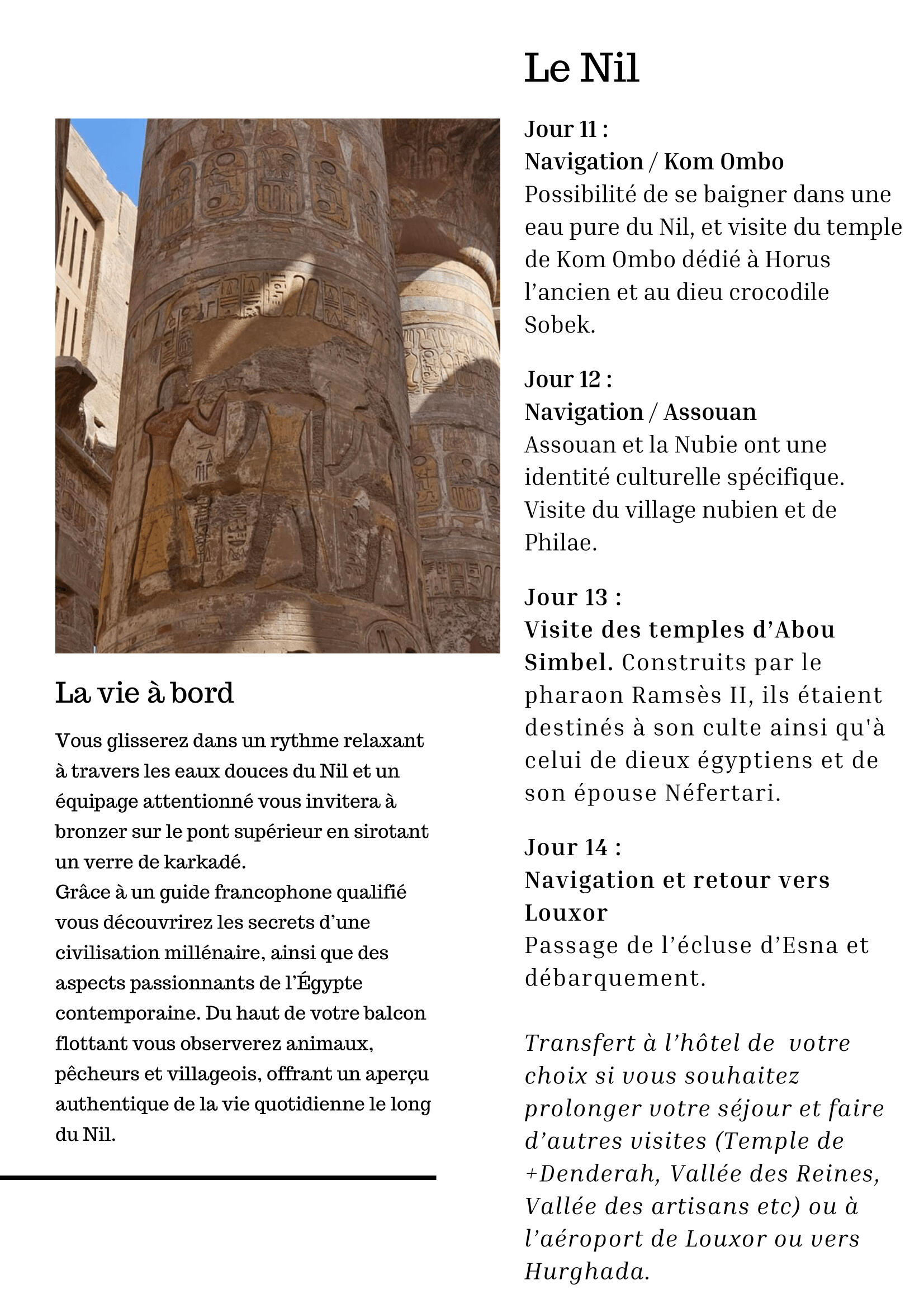 Grâce à un guide francophone qualifié vous découvrirez les secrets d’une civilisation millénaire, ainsi que des aspects passionnants de l’Égypte contemporaine. Du haut de votre balcon flottant vous observerez animaux, pêcheurs et villageois, offrant un aperçu authentique de la vie quotidienne le long du Nil.