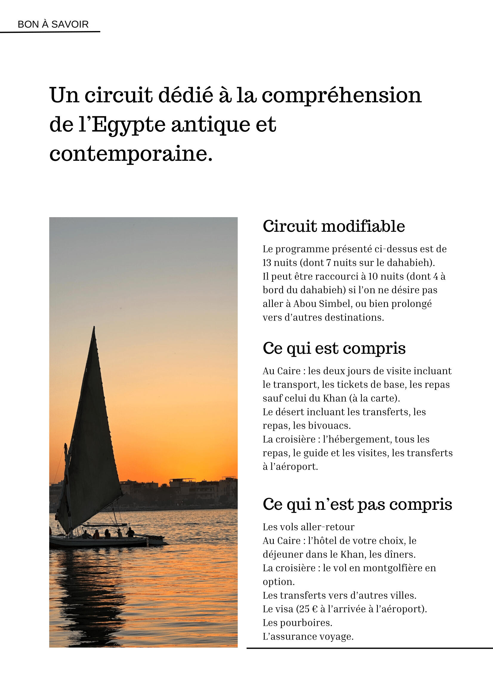 Profitez de deux à trois nuits à Louxor pour visiter les rives est et ouest puis embarquez jusqu’à Assouan pour une croisière à bord d’une dahabiya. Durant une semaine partez sur les traces des pharaons grâce à un programme unique !